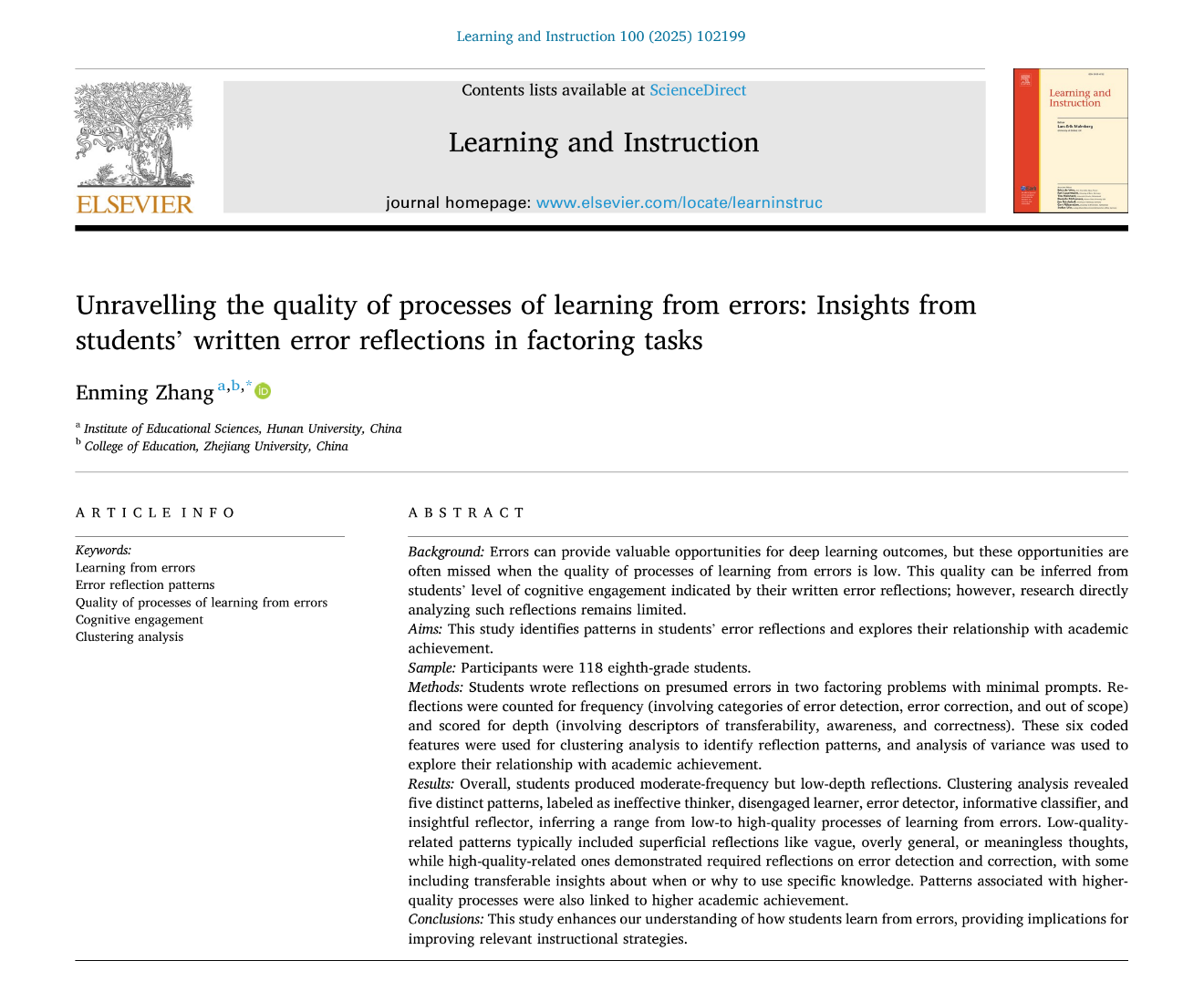 近日,教育科学研究院张恩铭老师在学习与教学研究领域取得新进展。该研究以“Unravelling the quality of processes of learning from errors: Insights from students' written error reflections in factoring tasks”为题,发表于课程与教学论领域权威期刊《Learning and Instruction》。